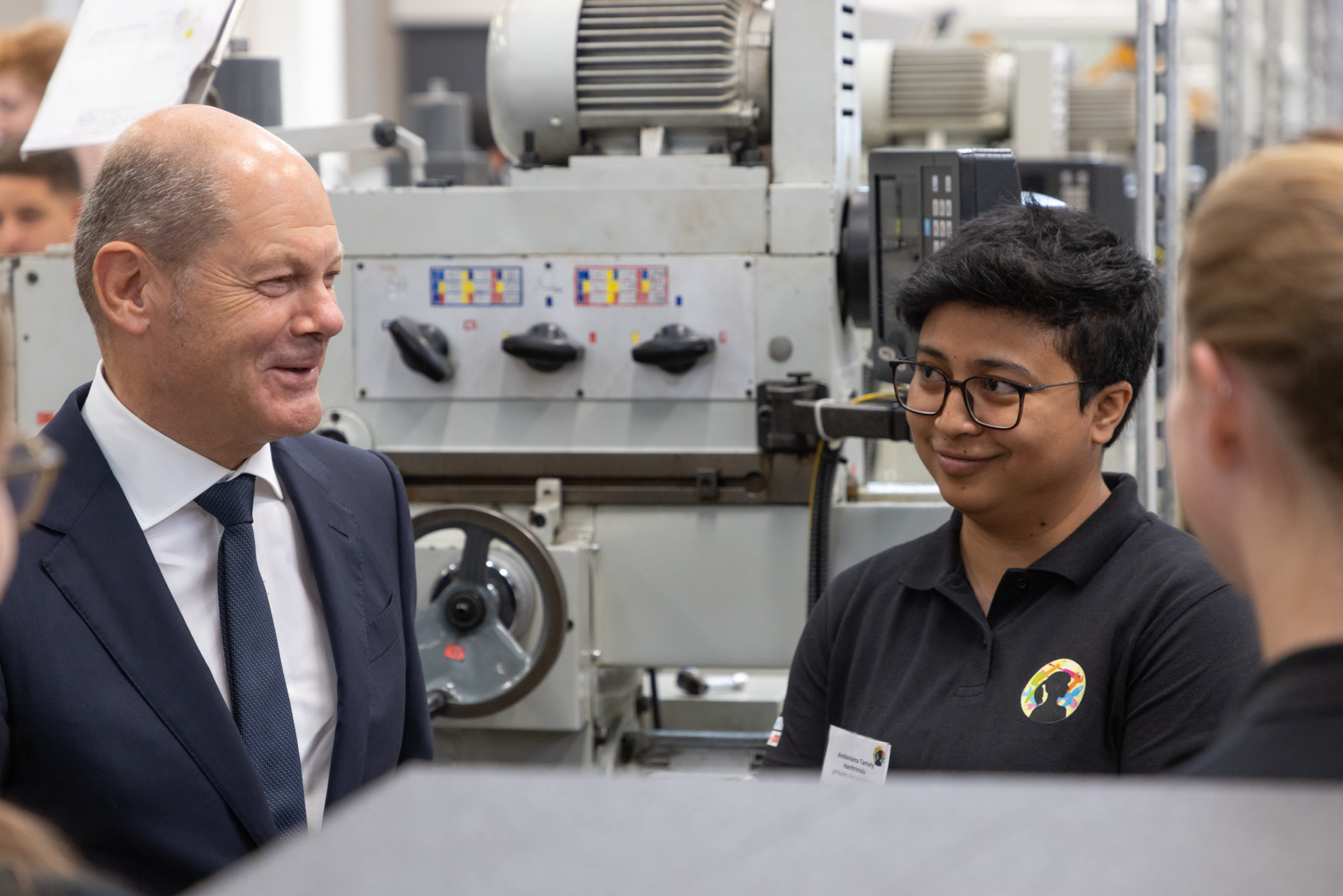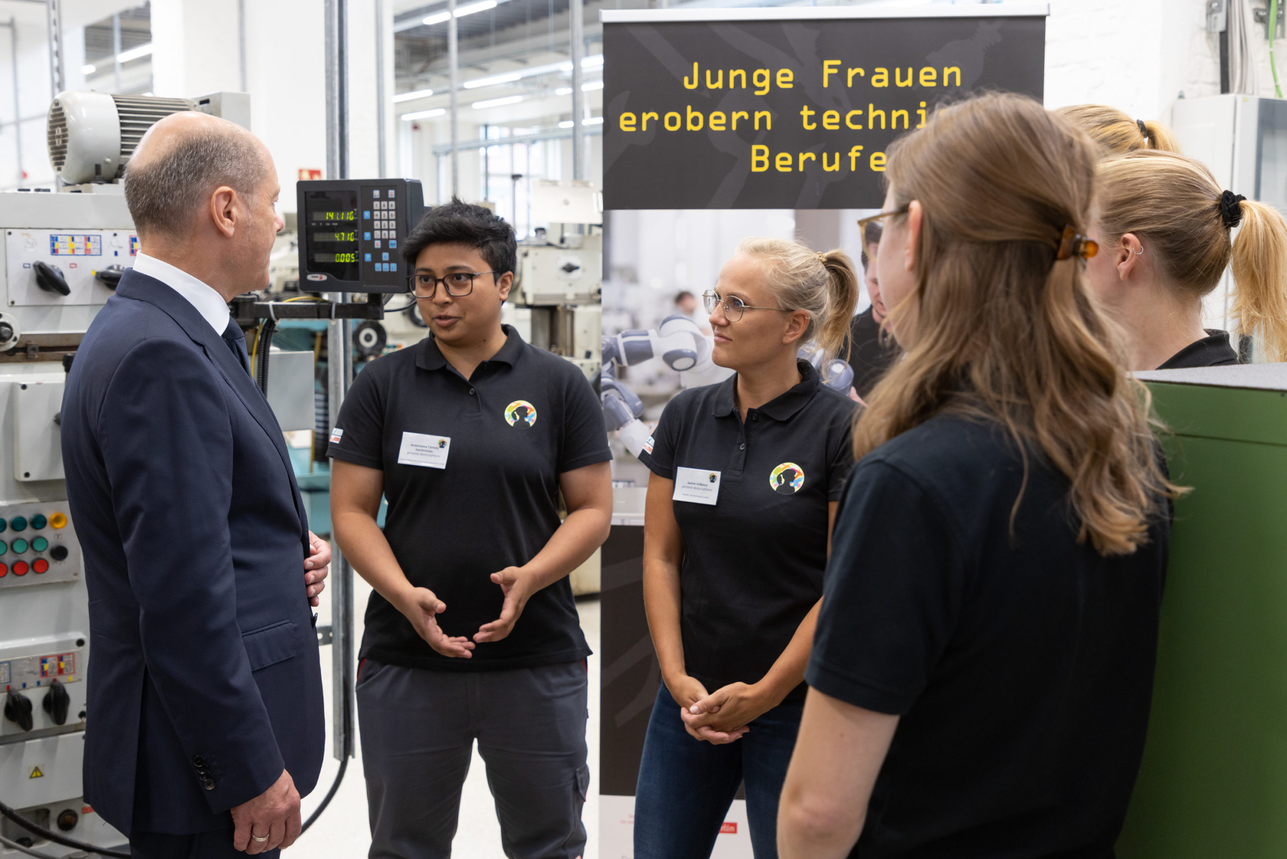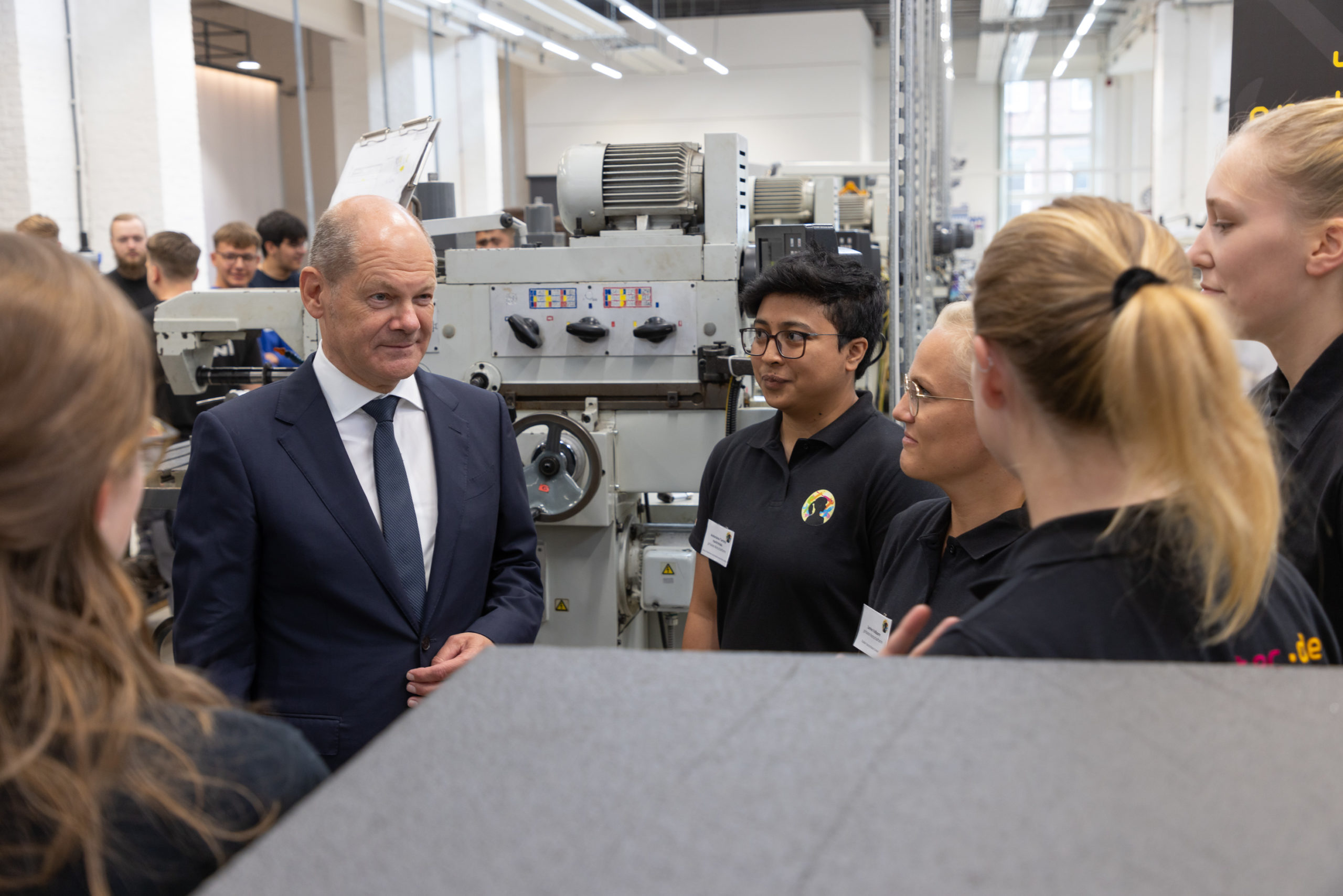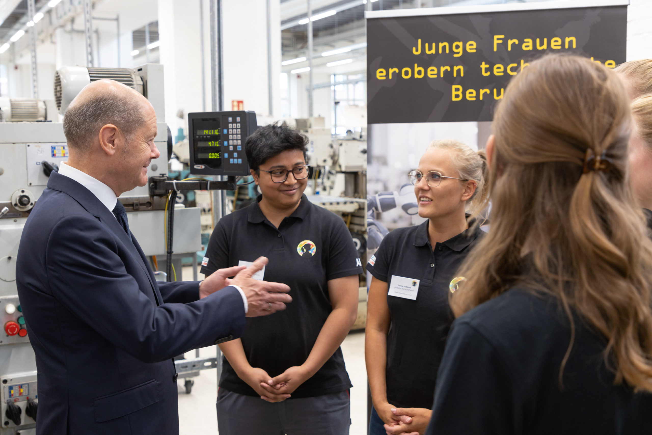 Die neuen Auszubildenden des ersten Lehrjahres wurden im Anschluss durch den Bundeskanzler persönlich begrüßt. Nach der wertschätzenden Rede ging es für diesen weiter durch die Werkstatt. Nach einem Einblick in die Fräserei stoppte Herr Scholz bei unseren girlsatec-Botschafterinnen und tausche sich mit diesen interessiert über Rollenvorbilder und Wege für Frauen in technische Berufe aus: