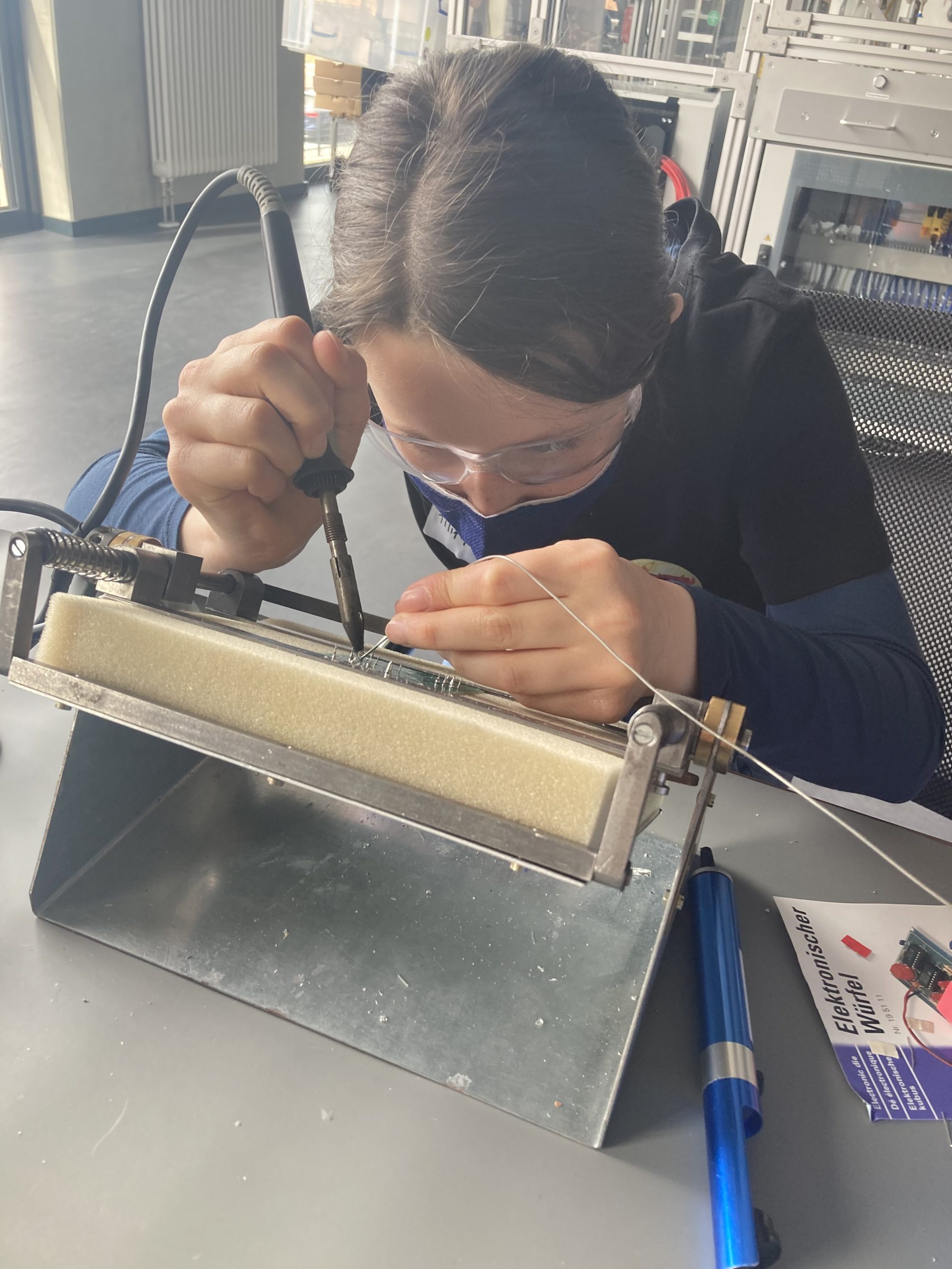 Am ersten Tag des Camps gab es eine Führung durch die Räumlichkeiten des Ausbildungszentrums, durch die Metallwerkstatt sowie den Elektrobereich. Im Neubau mit der Industrie 4.0 Anlage, fand schließlich die Einführung in das Löten statt. In den ersten Tagen gab es viele Informationen zu den unterschiedlichen Ausbildungsberufen, zum Projekt girlsatec und den Tätigkeitsfeldern der technischen Berufe. Nach den Grundlagen des Lötens und dazugehöriger Arbeitssicherheitsmaßnahmen durften die Schülerinnen und Schüler selbst ans Werk. Mit Freude löteten die Teilnehmenden ihre eigenen kleinen Projekte und Bausätze – von einem LED-Osterhasen, blinkenden Smileys über einen elektronischen Würfel bis hin zu einer akustischen Alarmanlage konnten viele Erfahrungen gesammelt werden. An Tag zwei wurden die Kenntnisse des ersten Tages vertieft und die Projekte fertiggestellt. Die Ergebnisse können sich sehen und auch hören lassen!