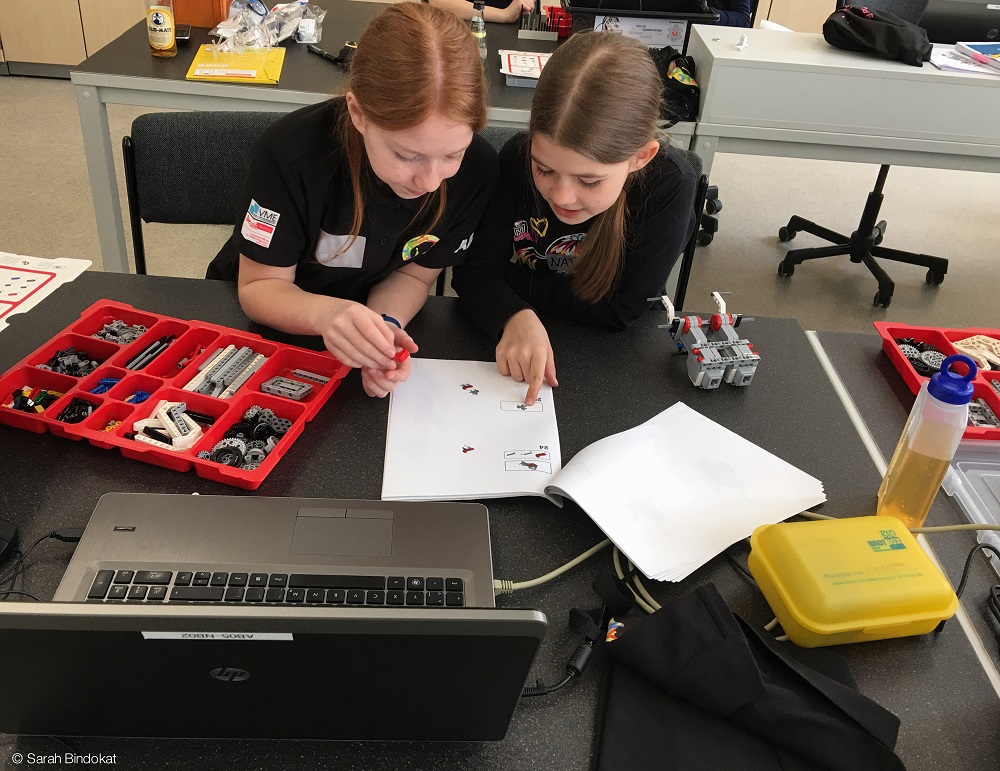 Praktisch, dass wir heute den Bereich Robotiks nicht ausgespart haben. Wir haben mit Legobausätzen Fahrzeuge zusammengebaut, deren Fahrtrichtung und -geschwindkeit wir am Computer programmiert haben. So konnte nicht nur Alica ihre Begeiesterung für Technik stärken, sondern auch die jüngeren Teilnehmerinnen Technik-Luft schnuppern.